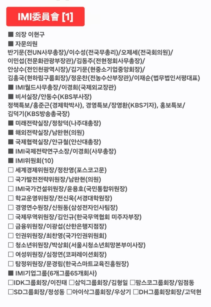 Ban Ki-moon (former UN Secretary-General)/Lee Soo-sung (former Prime Minister)/Oh Je-se (former National Assembly member)/Lee Min-seop (former Minister of Culture and Tourism)/Kim Dong-joo (former Secretary-General of Heon-jeong Society)/Ahn Sang-soo (former Mayor of Incheon Metropolitan City)/Kim Ki-moon (current Chairman of the Korea Federation of SMEs)/Kim Heung-guk (current Chairman of Harim Group)/Jeong Un-cheon (former Minister of Agriculture, Food and Rural Affairs)/Lee Jae-soon (CEO of Seopyung Law Firm)
